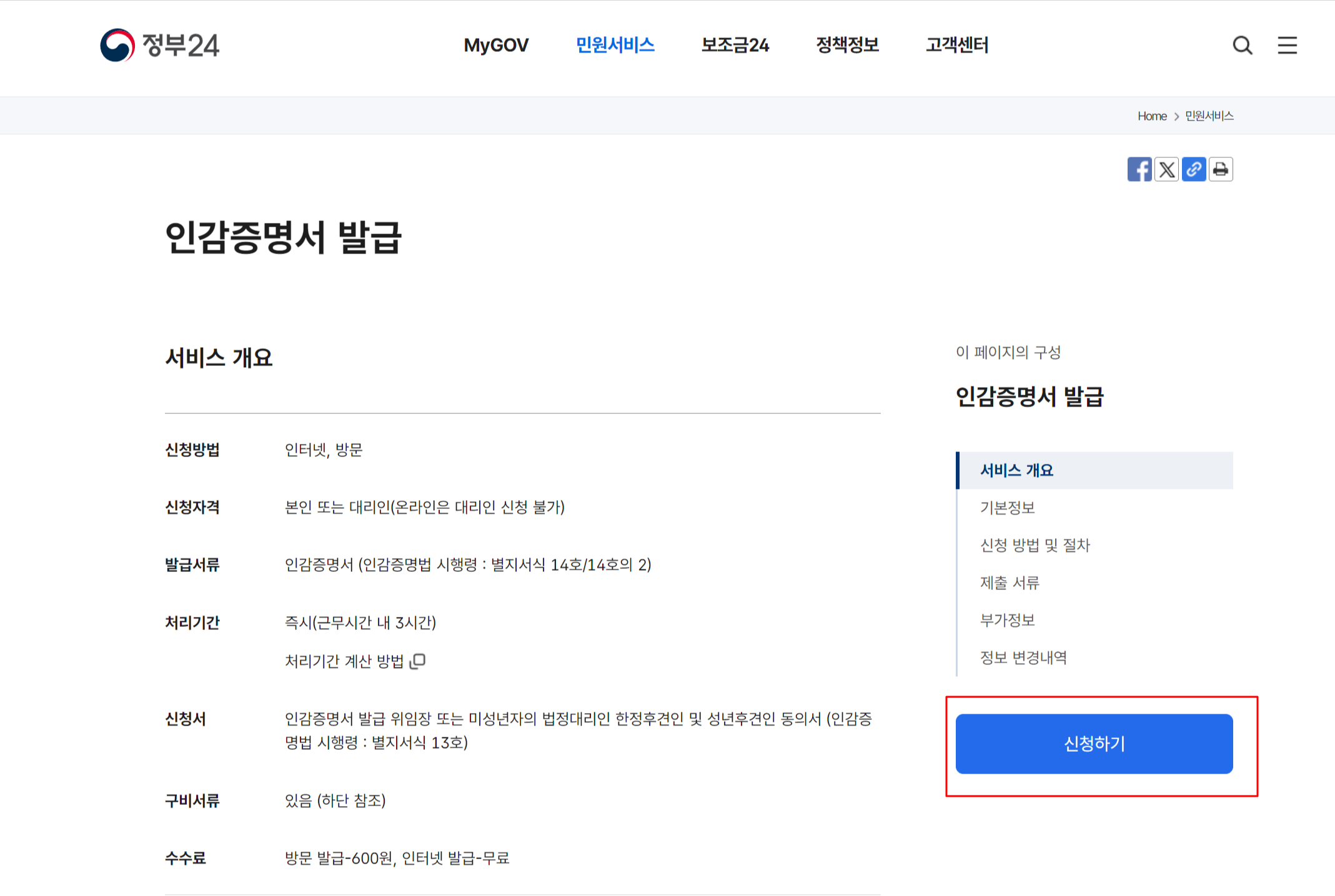 특별한 노하우가 필요한 것이 아닙니다. 정부 24 관련 페이지에 가서 신청하기 버튼을 클릭하며 끝 ! 인감증명서 발급 페이지로 바로갈 수 있도록, 링크를 걸어드리겠습니다. 조금이나마 이용에 도움이 되면 좋겟습니다.