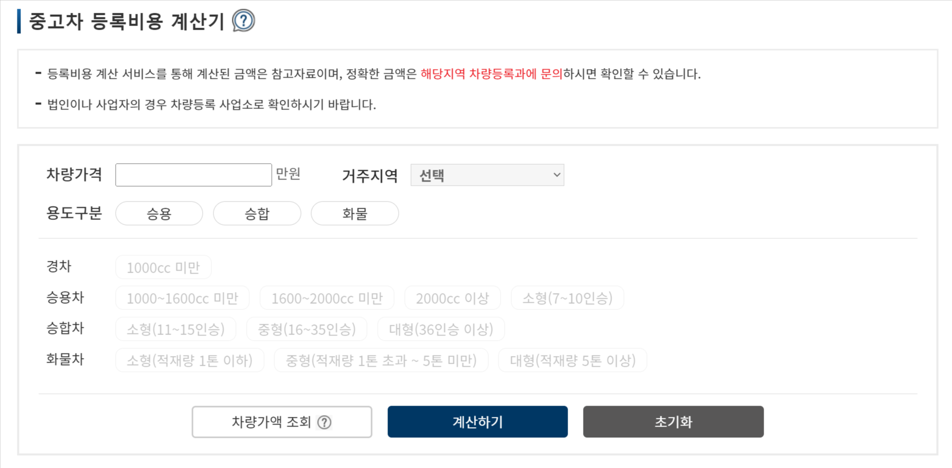 그러면 중고차 등록비용 계산기가 나타납니다. 여기에 본인이 조회해보고 싶은 차량의 정보를 기입해보세요. 예를들어 1천만원, 서울, 승용 1000~1600cc미만 승용차라고 가정해보겠습니다.