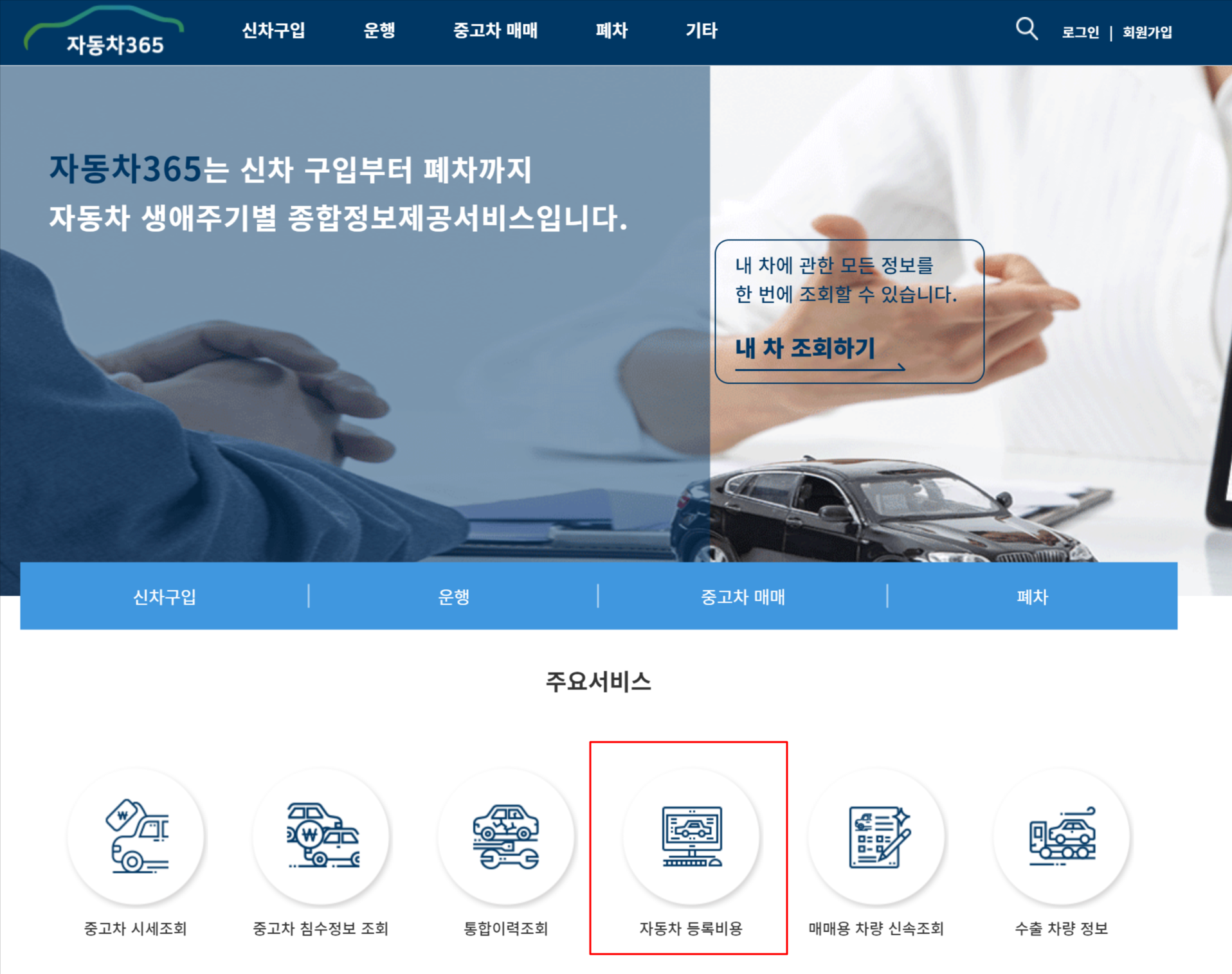 메인화면 중앙부분을 보시면 주요서비스에 자동차 등록비용이라는 항목이 보이실겁니다. 클릭하세요.