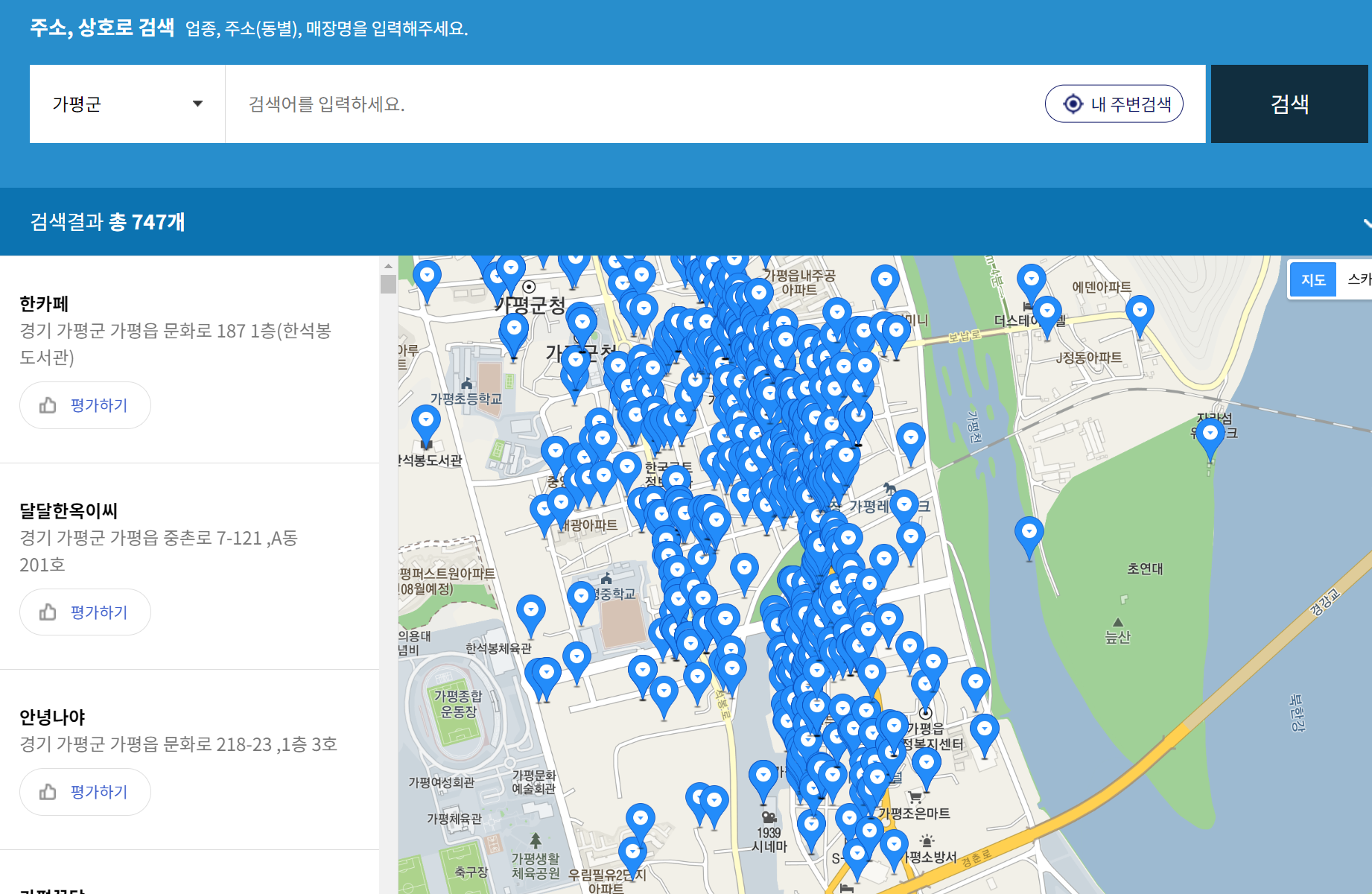 예를들어 가평군을 검색해보았습니다. 위와 같이 현 지도에서 확인되는 경기지역화폐 가맹점 총 갯수를 확인할 수 있고, 각 매장 위치를 확인할 수 있습니다.