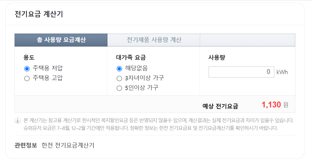 위의 구성요소에 따라 전기요금을 사전에 미리 계산하는 방법을 먼저 소개해드리겠습니다. 계산기를 이용하여 전기요금을 계산해보고, 아래 예시를 보시면 좀 더 이해가 쉬우실 겁니다.